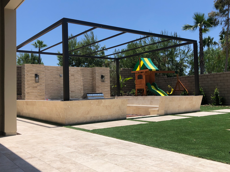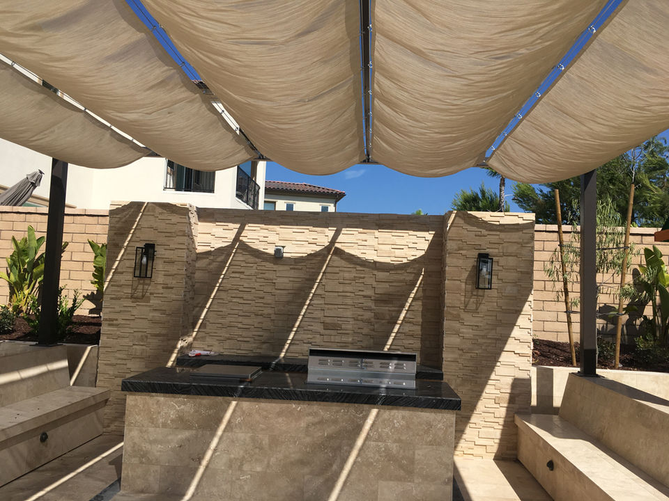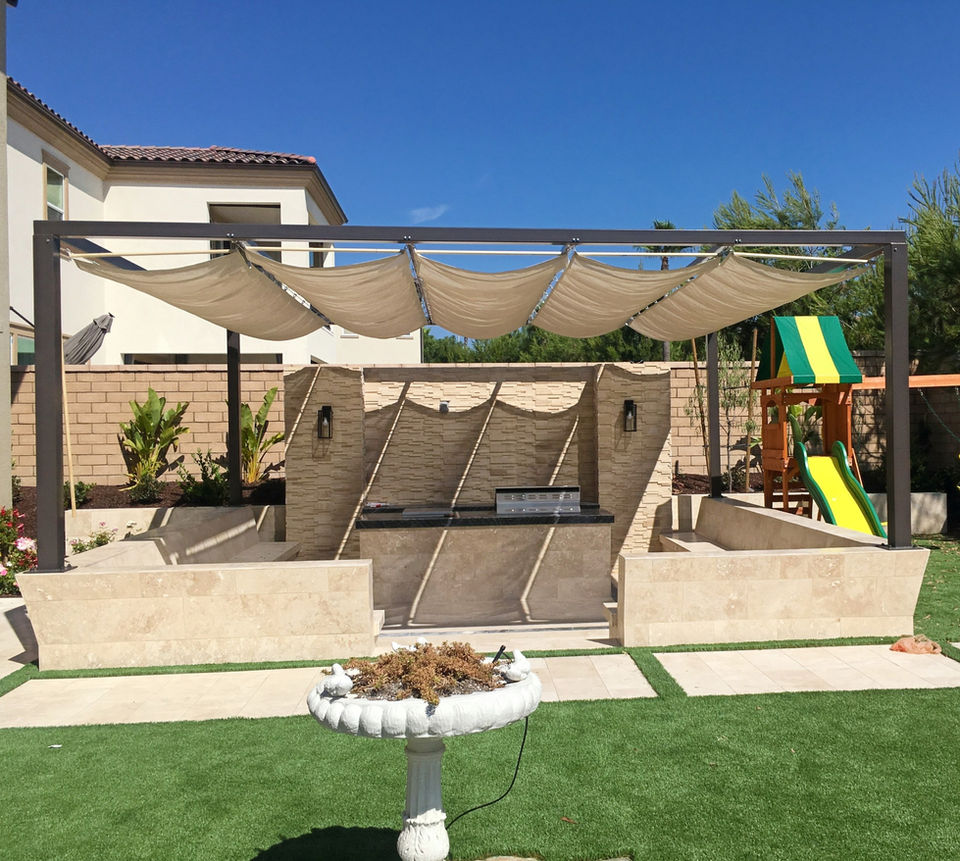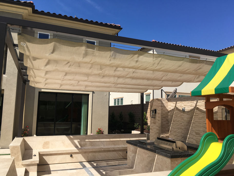 We were contracted to design an awning for a company. The client wanted a modern, stylish, and easy to use design for them to host parties and family reunions. We gave them multiple options in regards to different styles, either a rectangular structure with beams and a flat awning or a retractable awning. The chose the retractable awning to prevent water buildup on the top. We designed and custom cut the frame out of 2"x4" rectangular posts, drilled the feet in the base and painted the color requested. From there we added 10 stainless cable wires to work as lines to retract the awning panels. The client wanted a color similar to seating base so we chose Desert Sand Textilene 80. This outdoor mesh is great for shade and lets water through incase it isn't retracted during the rain. The final product came perfectly as the client envisioned it!